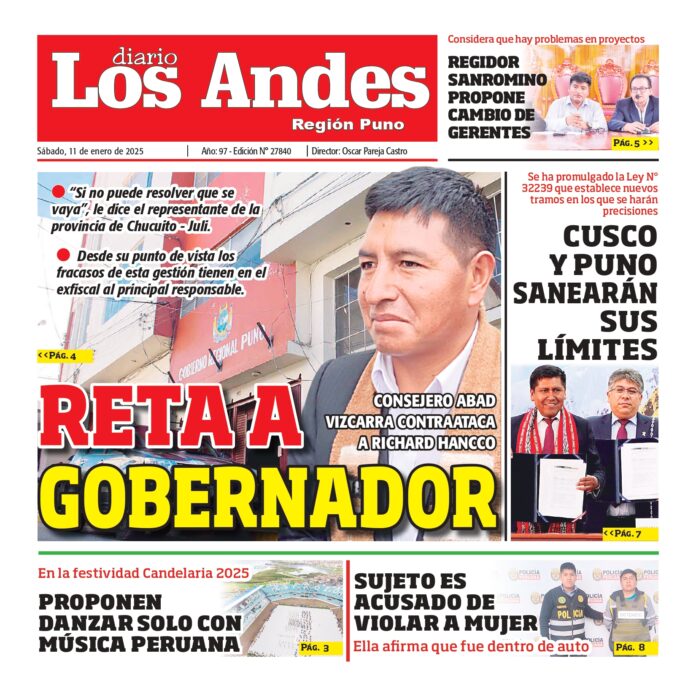Por: Diario los Andes Fecha: enero 11, 2025 DIARIO DIGITAL PUNO: Diario los Andes 11/01/2025 Vistas: 23 Artículo anteriorAREQUIPA: Diario los Andes 11/01/2025Artículo siguienteAREQUIPA: Diario los Andes 12/01/2025 Diario los Andes Compartir post: FacebookTwitterPinterestWhatsApp Suscríbete Quiero entrar He leído y acepto la Política de Privacidad. Populares Municipalidad de San Román realiza fumigación en colegios para inicio seguro del año escolar Puno: Maestros jubilados protestan en y exigen aumento de pensiones Puno: Cuestionan alza de tarifa de agua en Juliaca pese a deficiencias en el servicio Arequipa: GREA sancionará a I. E. Lord Byron tras desacato Arequipa: Denunciarán a Covisur por cierre de vía en Uchumayo Más vistosMás vistos Municipalidad de San Román realiza fumigación en colegios para inicio seguro del año escolar Diario los Andes - marzo 13, 2026 Redacción: Yudith Veronica Taco Huallpa La Municipalidad Provincial de... Puno: Maestros jubilados protestan en y exigen aumento de pensiones Diario los Andes - marzo 13, 2026 Redacción: Yudith Veronica Taco Huallpa Maestros cesantes y jubilados... Puno: Cuestionan alza de tarifa de agua en Juliaca pese a deficiencias en el servicio Diario los Andes - marzo 13, 2026 Redacción: Yudith Veronica Taco Huallpa El exdirigente del mercado... Arequipa: GREA sancionará a I. E. Lord Byron tras desacato Diario los Andes - marzo 13, 2026 Redacción: Thais Astoquilca Rivera El gerente regional de Educación, Marco...