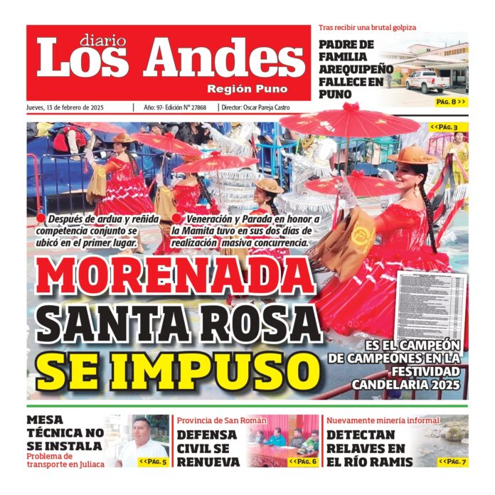 Por: Diario los Andes Fecha: febrero 13, 2025 DIARIO DIGITAL PUNO : Diario los Andes 13/02/2025 Vistas: 34 TagsDiario DigitalDiario Los AndesPuno Artículo anteriorAREQUIPA : Diario los Andes 13/02/2025Artículo siguientePUNO : Diario los Andes 14/02/2025 Diario los Andes Compartir post: FacebookTwitterPinterestWhatsApp Suscríbete Quiero entrar He leído y acepto la Política de Privacidad. Populares DIARIO LOS ANDES PUNO: 17/04/2026 DIARIO LOS ANDES AREQUIPA: 17/04/2026 JNE recibió más de 5 mil solicitudes de dispensa y justificación electoral Incautan mercadería de contrabando en la vía Moho-Huancané UNA Puno acumula deuda por arbitrios municipales por cerca a S/180 mil Más vistosMás vistos DIARIO LOS ANDES PUNO: 17/04/2026 admingeneral - abril 17, 2026 DIARIO LOS ANDES AREQUIPA: 17/04/2026 admingeneral - abril 17, 2026 JNE recibió más de 5 mil solicitudes de dispensa y justificación electoral admineditor - abril 16, 2026 El Jurado Nacional de Elecciones (JNE) recibió un total... Incautan mercadería de contrabando en la vía Moho-Huancané admineditor - abril 16, 2026 Personal del Área de Policía Fiscal Juliaca ejecutó el...
