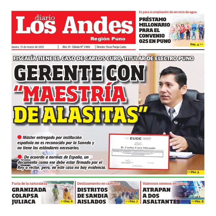 Por: Diario los Andes Fecha: marzo 13, 2025 DIARIO DIGITAL PUNO: Diario los Andes 13/03/2025 Vistas: 33 TagsDiario DigitalDiario Los AndesPuno Artículo anteriorAREQUIPA : Diario los Andes 13/03/2025Artículo siguienteAREQUIPA : Diario los Andes 14/03/2025 Diario los Andes Compartir post: FacebookTwitterPinterestWhatsApp Suscríbete Quiero entrar He leído y acepto la Política de Privacidad. Populares Puno: Varón muere tras presunta caída de cinco metros en Alto Huáscar INCIDENCIAS EN LAS ELECCIONES Sánchez lejos de Castillo en votos Keiko lidera y le siguen cuatro candidatos Semanario Los Andes 13/04/2026 Más vistosMás vistos Puno: Varón muere tras presunta caída de cinco metros en Alto Huáscar admineditor - abril 13, 2026 Un lamentable hecho se registró en el barrio Alto... INCIDENCIAS EN LAS ELECCIONES admineditor - abril 13, 2026 Redacción: Thais Astoquilca Rivera Un error de firmas movió a... Sánchez lejos de Castillo en votos admineditor - abril 13, 2026 En estas elecciones, el comportamiento electoral de la región... Keiko lidera y le siguen cuatro candidatos admineditor - abril 13, 2026 A boca de urna de encuestadora Datum, Fujimori habría...