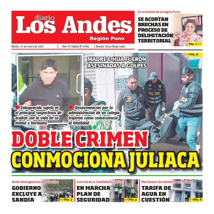 Por: Diario los Andes Fecha: enero 14, 2025 DIARIO DIGITAL PUNO: Diario los Andes 14/01/2025 Vistas: 29 TagsDiario DigitalDiario Los AndesPuno Artículo anteriorAREQUIPA: Diario los Andes 14/01/2025Artículo siguienteAREQUIPA: Diario los Andes 15/01/2025 Diario los Andes Compartir post: FacebookTwitterPinterestWhatsApp Suscríbete Quiero entrar He leído y acepto la Política de Privacidad. Populares Semanario Los Andes 13/04/2026 DIARIO LOS ANDES AREQUIPA: 12/04/2026 DIARIO LOS ANDES PUNO: 12/04/26 Arequipa: Precio del balón supera los S/50 en últimas semanas Arequipa: Detienen a adulto mayor acusado de tocamientos indebidos a menor Más vistosMás vistos Semanario Los Andes 13/04/2026 admingeneral - abril 12, 2026 DIARIO LOS ANDES AREQUIPA: 12/04/2026 admingeneral - abril 11, 2026 DIARIO LOS ANDES PUNO: 12/04/26 admingeneral - abril 11, 2026 Arequipa: Precio del balón supera los S/50 en últimas semanas admineditor - abril 11, 2026 Redacción: Jessimiel Rosas En el distrito de Cayma, el precio...