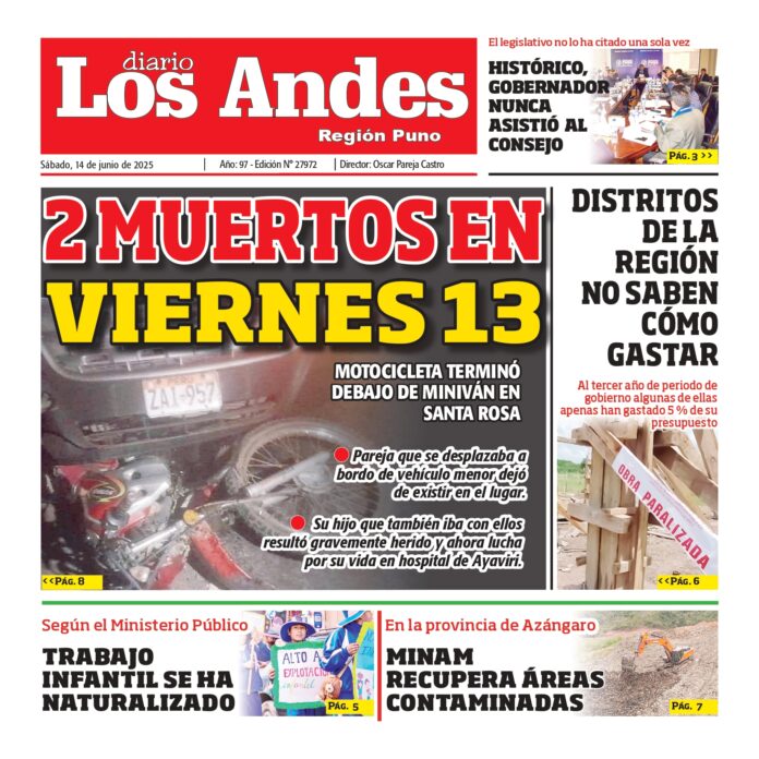 Por: Diario los Andes Fecha: junio 14, 2025 DIARIO DIGITAL PUNO: Diario los Andes 14/06/2025 Vistas: 25 TagsDiario DigitalDiario Los AndesPuno Artículo anteriorAREQUIPA: Diario los Andes 13/06/2025Artículo siguienteAREQUIPA: Diario los Andes 14/06/2025 Diario los Andes Compartir post: FacebookTwitterPinterestWhatsApp Suscríbete Quiero entrar He leído y acepto la Política de Privacidad. Populares Arequipa: Padre encuentra a su hijo desaparecido en la calle tras un mes de búsqueda Investigan presunta red de corrupción en el Municipio de Puno Ejecutarán acondicionamiento térmico en 10 colegios de la región UGEL San Román expone a los niños al sarampión Aimaras claman por indulto para Aduviri Más vistosMás vistos Arequipa: Padre encuentra a su hijo desaparecido en la calle tras un mes de búsqueda admineditor - abril 22, 2026 Redacción: Jessimiel Rosas Un padre encontró a su hijo desaparecido... Investigan presunta red de corrupción en el Municipio de Puno admineditor - abril 22, 2026 La Fiscalía Provincial Especializada en Delitos de Corrupción de... Ejecutarán acondicionamiento térmico en 10 colegios de la región admineditor - abril 22, 2026 El Programa Nacional de Infraestructura Educativa (Pronied), ejecutará intervenciones... UGEL San Román expone a los niños al sarampión admineditor - abril 22, 2026 Director parece ignorar los 32 casos que se han...