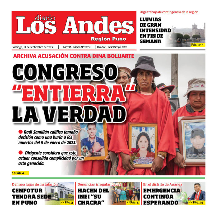 Por: Diario los Andes Fecha: septiembre 13, 2025 DIARIO DIGITAL PUNO: Diario Los Andes 14/09/2025 Vistas: 24 Artículo anteriorPUNO: Diario Los Andes 13/09/2025Artículo siguienteAREQUIPA: Diario Los Andes 14/09/2025 Diario los Andes Compartir post: FacebookTwitterPinterestWhatsApp Suscríbete Quiero entrar He leído y acepto la Política de Privacidad. Populares DIARIO LOS ANDES AREQUIPA: 22/04/26 DIARIO LOS ANDES PUNO: 22/04/26 Arequipa: Clínica sin autorización para cirugías es investigada tras muerte de joven Perú logra 23 medallas en los IV Juegos Suramericanos de la Juventud Panamá 2026 Arequipa: Vecinos de Huacapuy rechazan proyecto de crematorio en zona urbana de Camaná Más vistosMás vistos DIARIO LOS ANDES AREQUIPA: 22/04/26 admingeneral - abril 21, 2026 DIARIO LOS ANDES PUNO: 22/04/26 admingeneral - abril 21, 2026 Arequipa: Clínica sin autorización para cirugías es investigada tras muerte de joven admineditor - abril 21, 2026 Redacción: Jessimiel Rosas La muerte de una joven madre de... Perú logra 23 medallas en los IV Juegos Suramericanos de la Juventud Panamá 2026 admineditor - abril 21, 2026 La delegación peruana continúa destacando en los IV Juegos...