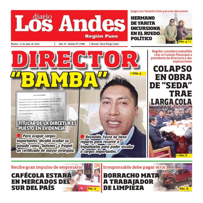 Por: Diario los Andes Fecha: julio 14, 2025 DIARIO DIGITAL PUNO: Diario los Andes 15/07/2025 Vistas: 65 TagsDiario DigitalDiario Los AndesPuno Artículo anteriorAREQUIPA: Diario los Andes 15/07/2025Artículo siguientePUNO: Diario los Andes 16/07/2025 Diario los Andes Compartir post: FacebookTwitterPinterestWhatsApp Suscríbete Quiero entrar He leído y acepto la Política de Privacidad. Populares Crean la Universidad Nacional Tecnológica Intercultural de Pomata Puno: Detectan conexiones clandestinas de aguas residuales Puno: Sereno grave tras ser embestido por combi de empresa “Dorado” Contraloría dispone que regidores y consejeros rindan cuentas Puno: Alianza con dirigentes magisteriales fue clave Más vistosMás vistos Crean la Universidad Nacional Tecnológica Intercultural de Pomata admineditor - abril 14, 2026 En el diario oficial El Peruano, se publicó la... Puno: Detectan conexiones clandestinas de aguas residuales admineditor - abril 14, 2026 La comuna provincial de Puno en coordinación con EMSA... Puno: Sereno grave tras ser embestido por combi de empresa “Dorado” admineditor - abril 14, 2026 Un agente de Serenazgo de la Municipalidad de Puno... Contraloría dispone que regidores y consejeros rindan cuentas admineditor - abril 14, 2026 La Contraloría General de la República dispuso que regidores...