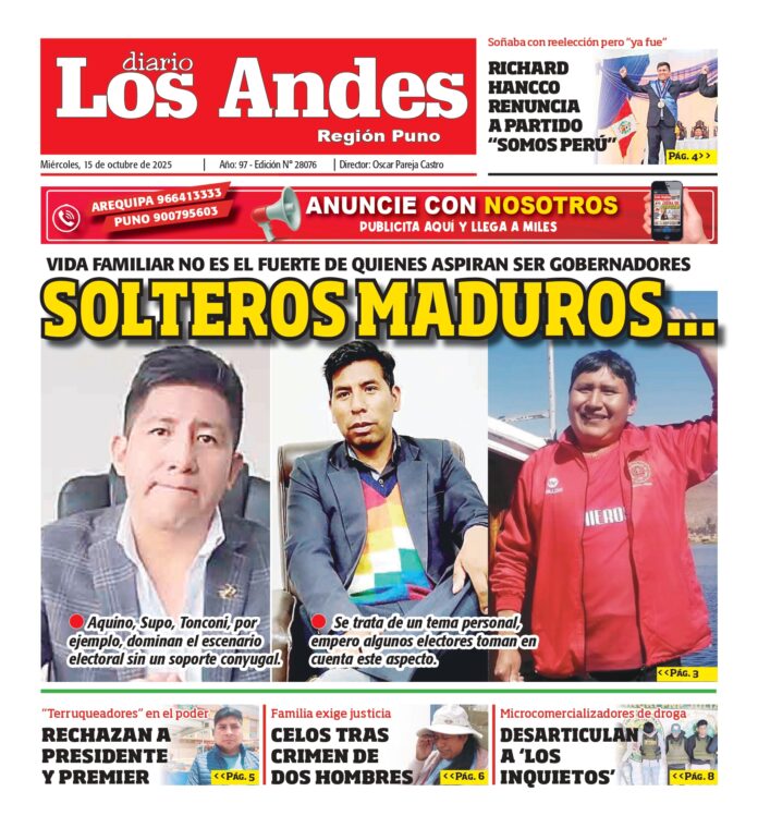 Por: Diario los Andes Fecha: octubre 15, 2025 DIARIO DIGITAL PUNO: Diario Los Andes 15/10/2025 Vistas: 68 TagsDiario DigitalDiario Los AndesPuno Artículo anteriorAREQUIPA: Diario Los Andes 15/10/2025Artículo siguienteAREQUIPA: Diario Los Andes 16/10/2025 Diario los Andes Compartir post: FacebookTwitterPinterestWhatsApp Suscríbete Quiero entrar He leído y acepto la Política de Privacidad. Populares A 25 se incrementan los casos de sarampión en la región Puno Sal de Maras: el tesoro natural del Perú que conquista cocinas y negocios Voto puneño fue determinante Puno: Varón muere tras presunta caída de cinco metros en Alto Huáscar INCIDENCIAS EN LAS ELECCIONES Más vistosMás vistos A 25 se incrementan los casos de sarampión en la región Puno admineditor - abril 13, 2026 Hasta hoy, lunes 13 de abril, los contagios de... Sal de Maras: el tesoro natural del Perú que conquista cocinas y negocios admineditor - abril 13, 2026 En un contexto donde los consumidores buscan productos naturales,... Voto puneño fue determinante admineditor - abril 13, 2026 Durante la jornada electoral de este 12 de abril... Puno: Varón muere tras presunta caída de cinco metros en Alto Huáscar admineditor - abril 13, 2026 Un lamentable hecho se registró en el barrio Alto...