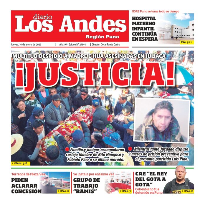 Por: Diario los Andes Fecha: enero 16, 2025 DIARIO DIGITAL PUNO: Diario los Andes 16/01/2025 Vistas: 32 TagsDiario DigitalDiario Los AndesPuno Artículo anteriorPUNO: Diario los Andes 15/01/2025Artículo siguienteAREQUIPA: Diario los Andes 16/01/2025 Diario los Andes Compartir post: FacebookTwitterPinterestWhatsApp Suscríbete Quiero entrar He leído y acepto la Política de Privacidad. Populares Keiko lidera y le siguen cuatro candidatos Semanario Los Andes 13/04/2026 DIARIO LOS ANDES AREQUIPA: 12/04/2026 DIARIO LOS ANDES PUNO: 12/04/26 Arequipa: Precio del balón supera los S/50 en últimas semanas Más vistosMás vistos Keiko lidera y le siguen cuatro candidatos admineditor - abril 13, 2026 A boca de urna de encuestadora Datum, Fujimori habría... Semanario Los Andes 13/04/2026 admingeneral - abril 12, 2026 DIARIO LOS ANDES AREQUIPA: 12/04/2026 admingeneral - abril 11, 2026 DIARIO LOS ANDES PUNO: 12/04/26 admingeneral - abril 11, 2026