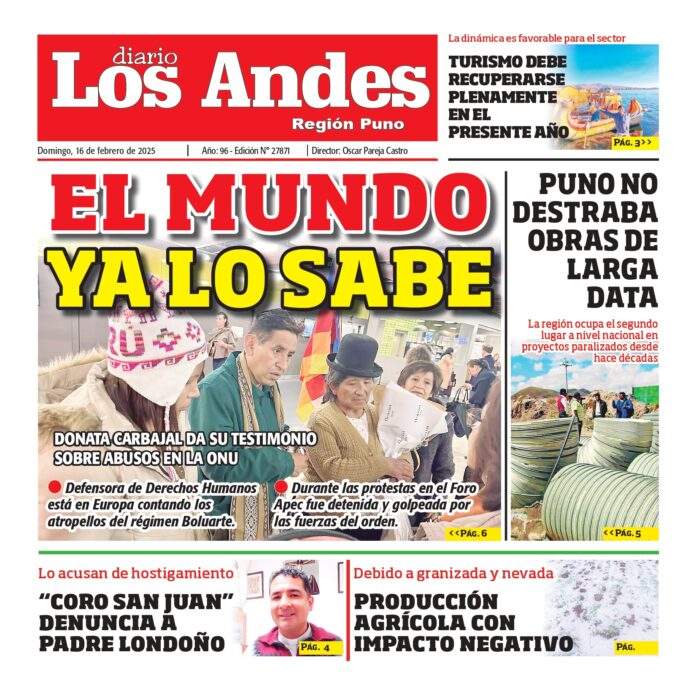 Por: Diario los Andes Fecha: febrero 16, 2025 DIARIO DIGITAL PUNO : Diario los Andes 16/02/2025 Vistas: 20 TagsDiario DigitalDiario Los AndesPuno Artículo anteriorAREQUIPA : Diario los Andes 16/02/2025Artículo siguienteSemanario Los Andes 17/02/2025 Diario los Andes Compartir post: FacebookTwitterPinterestWhatsApp Suscríbete Quiero entrar He leído y acepto la Política de Privacidad. Populares Arequipa: Techo de colegio José Olaya se cae a pedazos Más de 18 mil diabéticos en Puno en riesgo por insulina Si gobierno no da solución Ordet Juliaca hace advertencia: Pasajes subirán desde el lunes 16 Puno: Intervienen discotecas luego de varios pedidos Denuncian presunta agresión de sereno municipal en Portal de Flores en Arequipa Más vistosMás vistos Arequipa: Techo de colegio José Olaya se cae a pedazos Diario los Andes - marzo 14, 2026 Redacción: Julissa Aquino A dos días del inicio del Año... Más de 18 mil diabéticos en Puno en riesgo por insulina Diario los Andes - marzo 14, 2026 Redacción: Reynaldo Puma Más de 18 mil 800 pacientes diabéticos... Si gobierno no da solución Ordet Juliaca hace advertencia: Pasajes subirán desde el lunes 16 Diario los Andes - marzo 14, 2026 Redacción: Reynaldo Puma La Organización de Transportistas (Ordet) de... Puno: Intervienen discotecas luego de varios pedidos Diario los Andes - marzo 14, 2026 Redacción: Diario Los Andes Apenas fue designada como nueva...