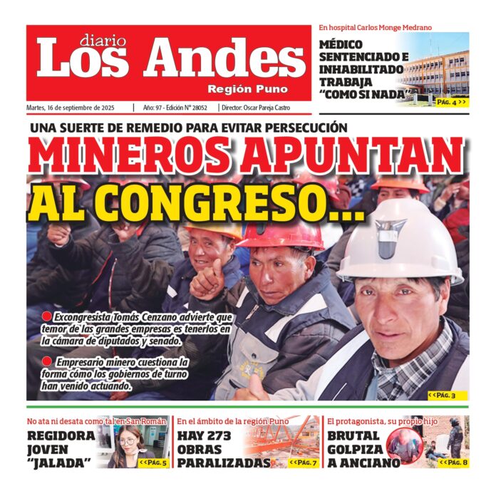 Por: Diario los Andes Fecha: septiembre 15, 2025 DIARIO DIGITAL PUNO: Diario Los Andes 16/09/2025 Vistas: 30 TagsDiario DigitalDiario Los AndesPuno Artículo anteriorAREQUIPA: Diario Los Andes 16/09/2025Artículo siguienteAREQUIPA: Diario Los Andes 17/09/2025 Diario los Andes Compartir post: FacebookTwitterPinterestWhatsApp Suscríbete Quiero entrar He leído y acepto la Política de Privacidad. Populares Seguridad en Arequipa limitada por falta de vehículos y agentes policiales Arequipa: Cobran hasta S/1.50 pese a tarifa oficial de S/1.30 en el SIT Arequipa: Actividades de Semana Santa comienzan con Vía Crucis en la Plaza de Armas Lima: Asesinan a candidato Gilbert Infante en Chorrillos tras semanas de amenazas Hallan restos de bebé en descampado de Socabaya y presumen ataque de perros Más vistosMás vistos Seguridad en Arequipa limitada por falta de vehículos y agentes policiales Diario los Andes - marzo 25, 2026 La región Arequipa enfrenta limitaciones en su capacidad de... Arequipa: Cobran hasta S/1.50 pese a tarifa oficial de S/1.30 en el SIT Diario los Andes - marzo 25, 2026 La Municipalidad Provincial de Arequipa oficializó desde hoy el... Arequipa: Actividades de Semana Santa comienzan con Vía Crucis en la Plaza de Armas Diario los Andes - marzo 25, 2026 La ciudad de Arequipa dará inicio a las celebraciones... Lima: Asesinan a candidato Gilbert Infante en Chorrillos tras semanas de amenazas Diario los Andes - marzo 25, 2026 Redacción: Yudith Veronica Taco Huallpa El candidato a diputado Gilbert...