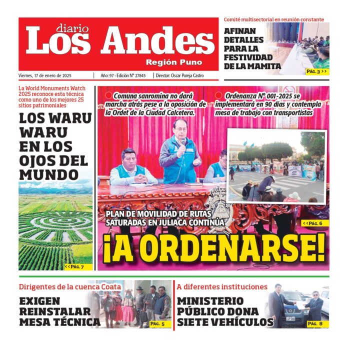 Por: Diario los Andes Fecha: enero 17, 2025 DIARIO DIGITAL PUNO: Diario los Andes 17/01/2025 Vistas: 30 TagsDiario DigitalDiario Los AndesPuno Artículo anteriorAREQUIPA: Diario los Andes 17/01/2025Artículo siguienteAREQUIPA: Diario los Andes 18/01/2025 Diario los Andes Compartir post: FacebookTwitterPinterestWhatsApp Suscríbete Quiero entrar He leído y acepto la Política de Privacidad. Populares Keiko lidera y le siguen cuatro candidatos Semanario Los Andes 13/04/2026 DIARIO LOS ANDES AREQUIPA: 12/04/2026 DIARIO LOS ANDES PUNO: 12/04/26 Arequipa: Precio del balón supera los S/50 en últimas semanas Más vistosMás vistos Keiko lidera y le siguen cuatro candidatos admineditor - abril 13, 2026 A boca de urna de encuestadora Datum, Fujimori habría... Semanario Los Andes 13/04/2026 admingeneral - abril 12, 2026 DIARIO LOS ANDES AREQUIPA: 12/04/2026 admingeneral - abril 11, 2026 DIARIO LOS ANDES PUNO: 12/04/26 admingeneral - abril 11, 2026
