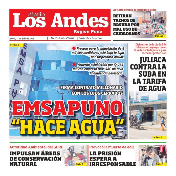 Por: Diario los Andes Fecha: julio 17, 2025 DIARIO DIGITAL PUNO: Diario los Andes 17/07/2025 Vistas: 47 TagsDiario DigitalDiario Los AndesPuno Artículo anteriorAREQUIPA: Diario los Andes 17/07/2025Artículo siguientePUNO: Diario los Andes 18/07/2025 Diario los Andes Compartir post: FacebookTwitterPinterestWhatsApp Suscríbete Quiero entrar He leído y acepto la Política de Privacidad. Populares Crean la Universidad Nacional Tecnológica Intercultural de Pomata Puno: Detectan conexiones clandestinas de aguas residuales Puno: Sereno grave tras ser embestido por combi de empresa “Dorado” Contraloría dispone que regidores y consejeros rindan cuentas Puno: Alianza con dirigentes magisteriales fue clave Más vistosMás vistos Crean la Universidad Nacional Tecnológica Intercultural de Pomata admineditor - abril 14, 2026 En el diario oficial El Peruano, se publicó la... Puno: Detectan conexiones clandestinas de aguas residuales admineditor - abril 14, 2026 La comuna provincial de Puno en coordinación con EMSA... Puno: Sereno grave tras ser embestido por combi de empresa “Dorado” admineditor - abril 14, 2026 Un agente de Serenazgo de la Municipalidad de Puno... Contraloría dispone que regidores y consejeros rindan cuentas admineditor - abril 14, 2026 La Contraloría General de la República dispuso que regidores...