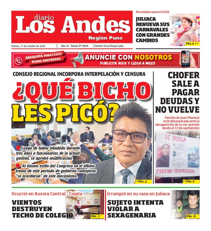 Por: Diario los Andes Fecha: octubre 17, 2025 DIARIO DIGITAL PUNO: Diario Los Andes 17/10/2025 Vistas: 156 Artículo anteriorAREQUIPA: Diario Los Andes 17/10/2025Artículo siguienteAREQUIPA: Diario Los Andes 18/10/2025 Diario los Andes Compartir post: FacebookTwitterPinterestWhatsApp Suscríbete Quiero entrar He leído y acepto la Política de Privacidad. Populares DIARIO LOS ANDES PUNO: 19/04/26 DIARIO LOS ANDES AREQUIPA: 19/04/26 Arequipa: Cierre temporal en calle Peral por obras de mejoramiento vial Operativo en Juliaca permite desarticular banda criminal y rescatar a tres mujeres Arequipa: Cerrarán puente Bolognesi por rodaje de película “Coquito” Más vistosMás vistos DIARIO LOS ANDES PUNO: 19/04/26 admingeneral - abril 18, 2026 DIARIO LOS ANDES AREQUIPA: 19/04/26 admingeneral - abril 18, 2026 Arequipa: Cierre temporal en calle Peral por obras de mejoramiento vial admineditor - abril 18, 2026 Redacción: Jessimiel Rosas Desde la noche del viernes 17 de... Operativo en Juliaca permite desarticular banda criminal y rescatar a tres mujeres admineditor - abril 18, 2026 Un operativo policial en la ciudad #Juliaca terminó con...