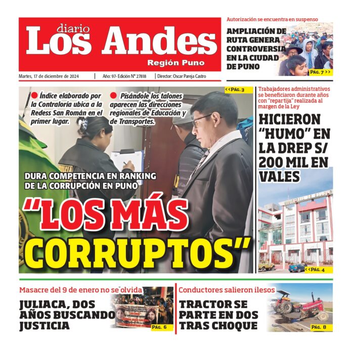 Por: Diario los Andes Fecha: diciembre 17, 2024 DIARIO DIGITAL PUNO: Diario los Andes 17/12/2024 Vistas: 31 TagsDiario DigitalDiario Los AndesPuno Artículo anteriorAREQUIPA: Diario los Andes 17/12/2024Artículo siguienteAREQUIPA: Diario los Andes 18/12/2024 Diario los Andes Compartir post: FacebookTwitterPinterestWhatsApp Suscríbete Quiero entrar He leído y acepto la Política de Privacidad. Populares DIARIO LOS ANDES PUNO: 17/04/2026 DIARIO LOS ANDES AREQUIPA: 17/04/2026 JNE recibió más de 5 mil solicitudes de dispensa y justificación electoral Incautan mercadería de contrabando en la vía Moho-Huancané UNA Puno acumula deuda por arbitrios municipales por cerca a S/180 mil Más vistosMás vistos DIARIO LOS ANDES PUNO: 17/04/2026 admingeneral - abril 17, 2026 DIARIO LOS ANDES AREQUIPA: 17/04/2026 admingeneral - abril 17, 2026 JNE recibió más de 5 mil solicitudes de dispensa y justificación electoral admineditor - abril 16, 2026 El Jurado Nacional de Elecciones (JNE) recibió un total... Incautan mercadería de contrabando en la vía Moho-Huancané admineditor - abril 16, 2026 Personal del Área de Policía Fiscal Juliaca ejecutó el...