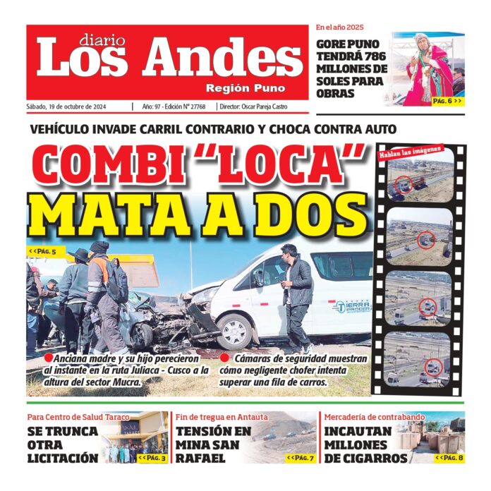 Por: Diario los Andes Fecha: octubre 19, 2024 DIARIO DIGITAL PUNO: Diario los Andes 19/10/2024 Vistas: 26 Artículo anteriorAREQUIPA: Diario los Andes 19/10/2024Artículo siguienteAREQUIPA: Diario los Andes 20/10/2024 Diario los Andes Compartir post: FacebookTwitterPinterestWhatsApp Suscríbete Quiero entrar He leído y acepto la Política de Privacidad. Populares DIARIO LOS ANDES PUNO: 30/04/26 DIARIO LOS ANDES AREQUIPA: 30/04/26 Incautan mercadería de contrabando en la vía Desaguadero–Moquegua Asalto a mano armada en Yunguyo ONPE inicia pago de S/ 165 a miembros de mesa de elecciones 2026 Más vistosMás vistos DIARIO LOS ANDES PUNO: 30/04/26 admingeneral - abril 30, 2026 DIARIO LOS ANDES AREQUIPA: 30/04/26 admingeneral - abril 30, 2026 Incautan mercadería de contrabando en la vía Desaguadero–Moquegua admineditor - abril 29, 2026 La policía incautó mercadería de contrabando valorizada en más... Asalto a mano armada en Yunguyo admineditor - abril 29, 2026 Un violento robo se registró este 28 de abril...