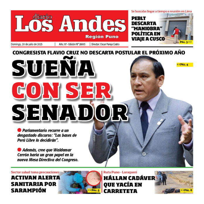 Por: Diario los Andes Fecha: julio 20, 2025 DIARIO DIGITAL PUNO: Diario los Andes 20/07/2025 Vistas: 34 Artículo anteriorAREQUIPA: Diario los Andes 19/07/2025Artículo siguienteArequipa: Diario Los Andes 20/07/2025 Diario los Andes Compartir post: FacebookTwitterPinterestWhatsApp Suscríbete Quiero entrar He leído y acepto la Política de Privacidad. Populares JNE recibió más de 5 mil solicitudes de dispensa y justificación electoral Incautan mercadería de contrabando en la vía Moho-Huancané UNA Puno acumula deuda por arbitrios municipales por cerca a S/180 mil Denunció a policías por robo y coima en Cayma Mañoso es detenido tras grave acusación Más vistosMás vistos JNE recibió más de 5 mil solicitudes de dispensa y justificación electoral admineditor - abril 16, 2026 El Jurado Nacional de Elecciones (JNE) recibió un total... Incautan mercadería de contrabando en la vía Moho-Huancané admineditor - abril 16, 2026 Personal del Área de Policía Fiscal Juliaca ejecutó el... UNA Puno acumula deuda por arbitrios municipales por cerca a S/180 mil admineditor - abril 16, 2026 La Universidad Nacional del Altiplano de Puno mantiene una... Denunció a policías por robo y coima en Cayma admineditor - abril 16, 2026 Redacción: Thais Astoquilca Rivera Chofer los acusó tras ser amenazado...