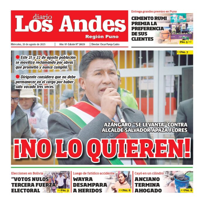 Por: Diario los Andes Fecha: agosto 19, 2025 DIARIO DIGITAL PUNO: Diario Los Andes 20/08/2025 Vistas: 22 TagsDiario DigitalDiario Los AndesPuno Artículo anteriorAREQUIPA: Diario Los Andes 20/08/2025Artículo siguienteAREQUIPA: Diario Los Andes 21/08/2025 Diario los Andes Compartir post: FacebookTwitterPinterestWhatsApp Suscríbete Quiero entrar He leído y acepto la Política de Privacidad. Populares Arequipa: Ambulantes persisten en San Camilo pese a operativos municipales Arequipa: Detienen a presunto estafador por venta de cerveza adulterada Atlético Grau y Alianza Atlético enfrentan duros retos en la fecha 12 del Apertura Perú recupera 18 bienes culturales repatriados desde Estados Unidos Arequipa: Colapso de desagüe inunda 3 viviendas Más vistosMás vistos Arequipa: Ambulantes persisten en San Camilo pese a operativos municipales admineditor - abril 25, 2026 El comercio informal sigue presente en los alrededores del... Arequipa: Detienen a presunto estafador por venta de cerveza adulterada admineditor - abril 25, 2026 Redacción: Jessimiel Rosas Agentes de la unidad de Halcones de... Atlético Grau y Alianza Atlético enfrentan duros retos en la fecha 12 del Apertura admineditor - abril 25, 2026 Redacción: Jessimiel Rosas La fecha 12 del Torneo Apertura de... Perú recupera 18 bienes culturales repatriados desde Estados Unidos admineditor - abril 25, 2026 Redacción: Jessimiel Rosas El Ministerio de Cultura del Perú verificó...