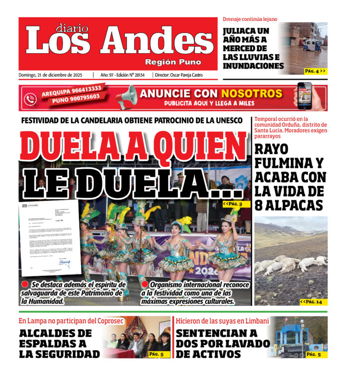 Por: Diario los Andes Fecha: diciembre 21, 2025 DIARIO DIGITAL PUNO: Diario Los Andes 21/12/2025 Vistas: 185 Artículo anteriorPUNO: Diario Los Andes 20/12/2025Artículo siguienteAREQUIPA: Diario Los Andes 21/12/2025 Diario los Andes Compartir post: FacebookTwitterPinterestWhatsApp Suscríbete Quiero entrar He leído y acepto la Política de Privacidad. Populares Semanario Los Andes 27/04/2026 DIARIO LOS ANDES AREQUIPA: 26/04/26 DIARIO LOS ANDES PUNO: 26/04/26 Arequipa: Ambulantes persisten en San Camilo pese a operativos municipales Arequipa: Detienen a presunto estafador por venta de cerveza adulterada Más vistosMás vistos Semanario Los Andes 27/04/2026 admingeneral - abril 26, 2026 DIARIO LOS ANDES AREQUIPA: 26/04/26 admingeneral - abril 25, 2026 DIARIO LOS ANDES PUNO: 26/04/26 admingeneral - abril 25, 2026 Arequipa: Ambulantes persisten en San Camilo pese a operativos municipales admineditor - abril 25, 2026 El comercio informal sigue presente en los alrededores del...