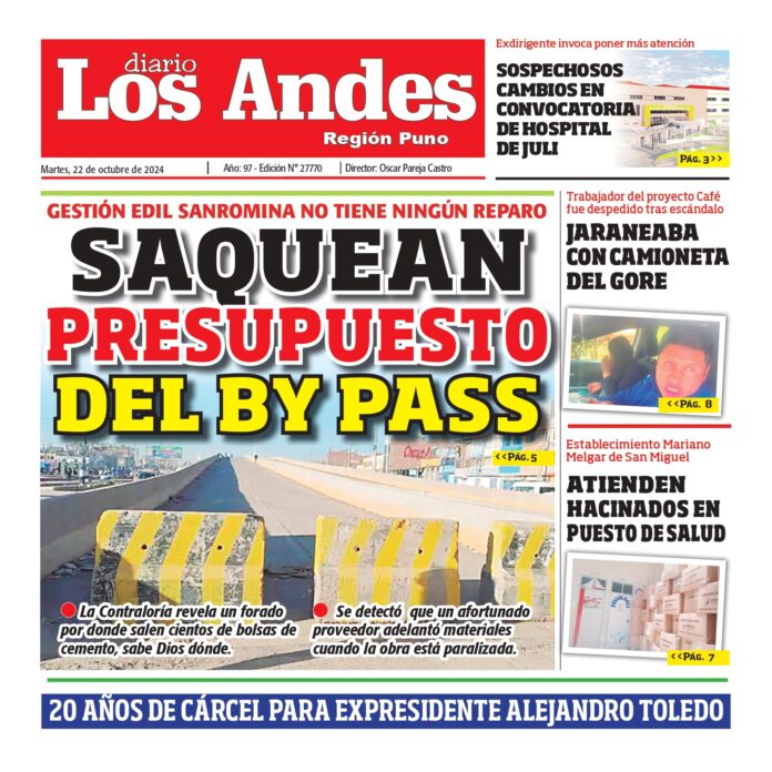 Por: Diario los Andes Fecha: octubre 22, 2024 DIARIO DIGITAL PUNO: Diario los Andes 22/10/2024 Vistas: 18 Artículo anteriorAREQUIPA: Diario los Andes 22/10/2024Artículo siguienteAREQUIPA: Diario los Andes 23/10/2024 Diario los Andes Compartir post: FacebookTwitterPinterestWhatsApp Suscríbete Quiero entrar He leído y acepto la Política de Privacidad. Populares Arequipa: Ninguno participó en la sesión solemne por los 37 años del Gobierno Regional Arequipa: Quejas sobre obra en Yanahuara Incautan mercancía de contrabando valorizada en más de S/32 mil en Desaguadero Liberan más de 31 mil alevinos de Carachi en Lagunillas COER alerta lluvias en provincias del norte de la región Puno Más vistosMás vistos Arequipa: Ninguno participó en la sesión solemne por los 37 años del Gobierno Regional admineditor - abril 15, 2026 Redacción: Jean Frisancho Consejeros no asistieron a ceremonia de la... Arequipa: Quejas sobre obra en Yanahuara admineditor - abril 15, 2026 Redacción: Jean Frisancho Cerraron pase peatonal en puente provisional de... Incautan mercancía de contrabando valorizada en más de S/32 mil en Desaguadero admineditor - abril 15, 2026 Un operativo conjunto entre la Policía Nacional del Perú... Liberan más de 31 mil alevinos de Carachi en Lagunillas admineditor - abril 15, 2026 Un total de 31 mil 800 alevinos de carachi...