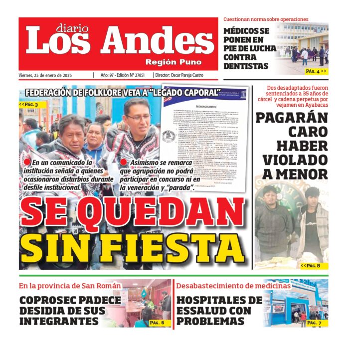 Por: Diario los Andes Fecha: enero 24, 2025 DIARIO DIGITAL PUNO: Diario los Andes 24/01/2025 Vistas: 22 TagsDiario DigitalDiario Los AndesPuno Artículo anteriorAREQUIPA: Diario los Andes 24/01/2025Artículo siguienteAREQUIPA: Diario los Andes 25/01/2025 Diario los Andes Compartir post: FacebookTwitterPinterestWhatsApp Suscríbete Quiero entrar He leído y acepto la Política de Privacidad. Populares Sánchez lejos de Castillo en votos Keiko lidera y le siguen cuatro candidatos Semanario Los Andes 13/04/2026 DIARIO LOS ANDES AREQUIPA: 12/04/2026 DIARIO LOS ANDES PUNO: 12/04/26 Más vistosMás vistos Sánchez lejos de Castillo en votos admineditor - abril 13, 2026 En estas elecciones, el comportamiento electoral de la región... Keiko lidera y le siguen cuatro candidatos admineditor - abril 13, 2026 A boca de urna de encuestadora Datum, Fujimori habría... Semanario Los Andes 13/04/2026 admingeneral - abril 12, 2026 DIARIO LOS ANDES AREQUIPA: 12/04/2026 admingeneral - abril 11, 2026