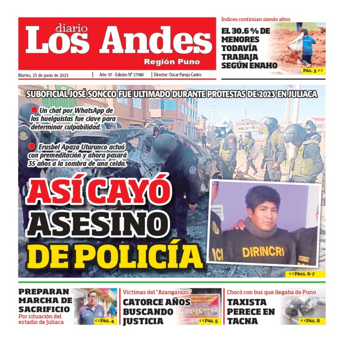 Por: Diario los Andes Fecha: junio 24, 2025 DIARIO DIGITAL PUNO: Diario los Andes 24/06/2025 Vistas: 31 TagsDiario DigitalDiario Los AndesPuno Artículo anteriorAREQUIPA: Diario los Andes 24/06/2025Artículo siguienteAREQUIPA: Diario los Andes 25/06/2025 Diario los Andes Compartir post: FacebookTwitterPinterestWhatsApp Suscríbete Quiero entrar He leído y acepto la Política de Privacidad. Populares Semanario Los Andes 13/04/2026 DIARIO LOS ANDES AREQUIPA: 12/04/2026 DIARIO LOS ANDES PUNO: 12/04/26 Arequipa: Precio del balón supera los S/50 en últimas semanas Arequipa: Detienen a adulto mayor acusado de tocamientos indebidos a menor Más vistosMás vistos Semanario Los Andes 13/04/2026 admingeneral - abril 12, 2026 DIARIO LOS ANDES AREQUIPA: 12/04/2026 admingeneral - abril 11, 2026 DIARIO LOS ANDES PUNO: 12/04/26 admingeneral - abril 11, 2026 Arequipa: Precio del balón supera los S/50 en últimas semanas admineditor - abril 11, 2026 Redacción: Jessimiel Rosas En el distrito de Cayma, el precio...