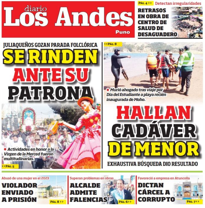 Por: Diario los Andes Fecha: septiembre 25, 2024 DIARIO DIGITAL PUNO: Diario Los Andes 25/09/2024 Vistas: 16 Artículo anteriorAREQUIPA: Diario Los Andes 25/09/2024Artículo siguienteAREQUIPA: Diario Los Andes 26/09/2024 Diario los Andes Compartir post: FacebookTwitterPinterestWhatsApp Suscríbete Quiero entrar He leído y acepto la Política de Privacidad. Populares Arequipa: Joven madre asegura que no sabía que estaba embarazada y busca recuperar a su bebé tras presunto abandono en Socabaya Arequipa: Cuarenta comisarías en riesgo de colapso Arequipa: GREA solicitó 141 aulas prefabricadas para cubrir necesidad Transportistas protestaron en el frontis de la comuna pidiendo que se permita el cobro de S/ 1.50 Precario inicio del año escolar 2026 en colegio Mariano H. Cornejo en Juliaca Más vistosMás vistos Arequipa: Joven madre asegura que no sabía que estaba embarazada y busca recuperar a su bebé tras presunto abandono en Socabaya Diario los Andes - marzo 17, 2026 Redacción: Yudith Veronica Taco Huallpa Una joven madre de... Arequipa: Cuarenta comisarías en riesgo de colapso Diario los Andes - marzo 17, 2026 Redacción: Julissa Aquino Al menos 40 comisarías de la Región... Arequipa: GREA solicitó 141 aulas prefabricadas para cubrir necesidad Diario los Andes - marzo 17, 2026 Redacción: Thais Astoquilca Rivera A pesar del inicio del año... Transportistas protestaron en el frontis de la comuna pidiendo que se permita el cobro de S/ 1.50 Diario los Andes - marzo 17, 2026 Redacción: Diario Los Andes Este jueves, en sesión extraordinaria,...