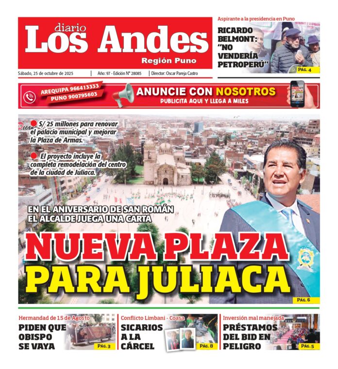 Por: Diario los Andes Fecha: octubre 25, 2025 DIARIO DIGITAL PUNO: Diario Los Andes 25/10/2025 Vistas: 56 Artículo anteriorAREQUIPA: Diario Los Andes 25/10/2025Artículo siguientePUNO: Diario Los Andes 26/10/2025 Diario los Andes Compartir post: FacebookTwitterPinterestWhatsApp Suscríbete Quiero entrar He leído y acepto la Política de Privacidad. Populares Robaban a bordo de una mototaxi Marcha para sacara jefe de la Sunass Reinicio con tropiezos dela vía Checca – Mazocruz Brote de sarampión encuentra ambulancias abandonadas DIARIO LOS ANDES PUNO: 21/04/26 Más vistosMás vistos Robaban a bordo de una mototaxi admineditor - abril 21, 2026 Dos presuntos integrantes de la banda criminal ‘Los elegantes... Marcha para sacara jefe de la Sunass admineditor - abril 21, 2026 El dirigente de las Cuatro Zonas de Juliaca, Juan... Reinicio con tropiezos dela vía Checca – Mazocruz admineditor - abril 21, 2026 Un informe reciente de la Contraloría advirtió varios problemas... Brote de sarampión encuentra ambulancias abandonadas admineditor - abril 21, 2026 De acuerdo a denuncias y pruebas llegadas a la...