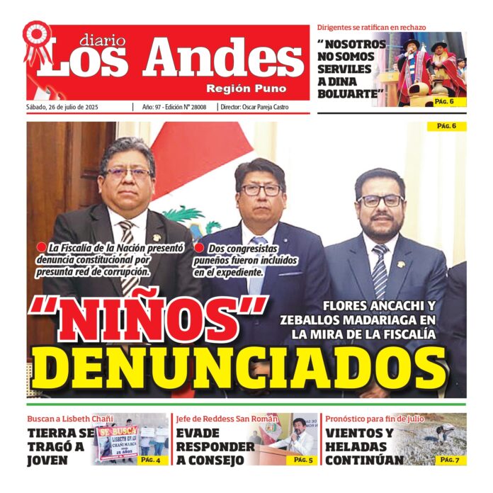 Por: Diario los Andes Fecha: julio 26, 2025 DIARIO DIGITAL PUNO: Diario Los Andes 26/07/2025 Vistas: 25 TagsDiario DigitalDiario Los AndesPuno Artículo anteriorAREQUIPA: Diario Los Andes 26/07/2025Artículo siguientePUNO: Diario Los Andes 27/07/2025 Diario los Andes Compartir post: FacebookTwitterPinterestWhatsApp Suscríbete Quiero entrar He leído y acepto la Política de Privacidad. Populares Crean la Universidad Nacional Tecnológica Intercultural de Pomata Puno: Detectan conexiones clandestinas de aguas residuales Puno: Sereno grave tras ser embestido por combi de empresa “Dorado” Contraloría dispone que regidores y consejeros rindan cuentas Puno: Alianza con dirigentes magisteriales fue clave Más vistosMás vistos Crean la Universidad Nacional Tecnológica Intercultural de Pomata admineditor - abril 14, 2026 En el diario oficial El Peruano, se publicó la... Puno: Detectan conexiones clandestinas de aguas residuales admineditor - abril 14, 2026 La comuna provincial de Puno en coordinación con EMSA... Puno: Sereno grave tras ser embestido por combi de empresa “Dorado” admineditor - abril 14, 2026 Un agente de Serenazgo de la Municipalidad de Puno... Contraloría dispone que regidores y consejeros rindan cuentas admineditor - abril 14, 2026 La Contraloría General de la República dispuso que regidores...