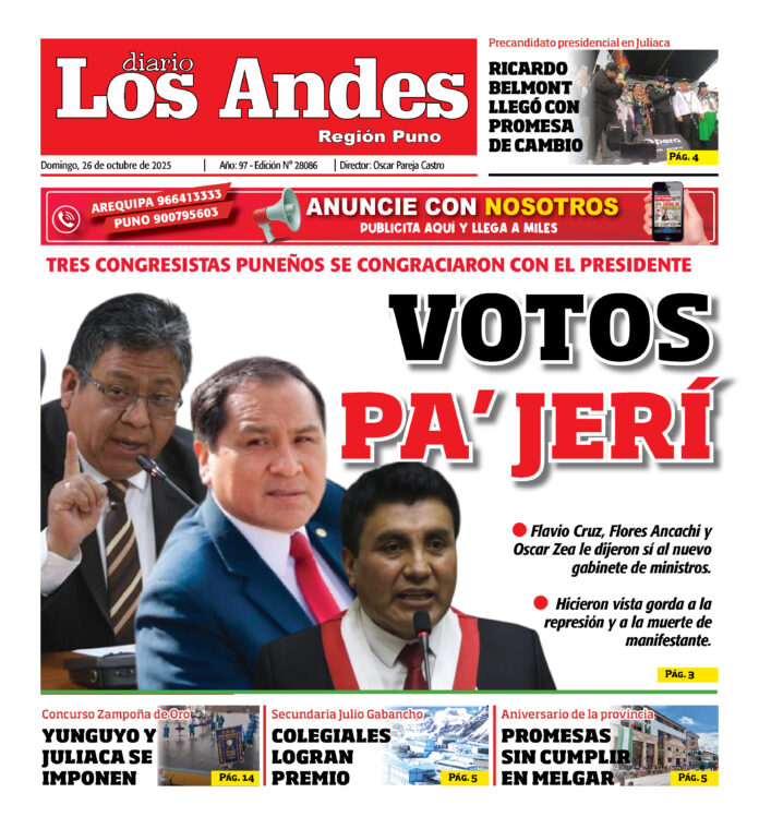 Por: Diario los Andes Fecha: octubre 25, 2025 DIARIO DIGITAL PUNO: Diario Los Andes 26/10/2025 Vistas: 47 Artículo anteriorPUNO: Diario Los Andes 25/10/2025Artículo siguienteAREQUIPA: Diario Los Andes 26/10/2025 Diario los Andes Compartir post: FacebookTwitterPinterestWhatsApp Suscríbete Quiero entrar He leído y acepto la Política de Privacidad. Populares Robaban a bordo de una mototaxi Marcha para sacara jefe de la Sunass Reinicio con tropiezos dela vía Checca – Mazocruz Brote de sarampión encuentra ambulancias abandonadas DIARIO LOS ANDES PUNO: 21/04/26 Más vistosMás vistos Robaban a bordo de una mototaxi admineditor - abril 21, 2026 Dos presuntos integrantes de la banda criminal ‘Los elegantes... Marcha para sacara jefe de la Sunass admineditor - abril 21, 2026 El dirigente de las Cuatro Zonas de Juliaca, Juan... Reinicio con tropiezos dela vía Checca – Mazocruz admineditor - abril 21, 2026 Un informe reciente de la Contraloría advirtió varios problemas... Brote de sarampión encuentra ambulancias abandonadas admineditor - abril 21, 2026 De acuerdo a denuncias y pruebas llegadas a la...