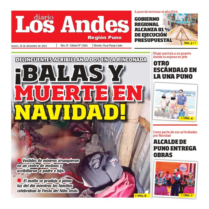 Por: Diario los Andes Fecha: diciembre 26, 2024 DIARIO DIGITAL PUNO: Diario los Andes 26/12/2024 Vistas: 32 TagsDiario DigitalDiario Los AndesPuno Artículo anteriorAREQUIPA: Diario los Andes 26/12/2024Artículo siguienteAREQUIPA: Diario los Andes 27/12/2024 Diario los Andes Compartir post: FacebookTwitterPinterestWhatsApp Suscríbete Quiero entrar He leído y acepto la Política de Privacidad. Populares Semanario Los Andes 13/04/2026 DIARIO LOS ANDES AREQUIPA: 12/04/2026 DIARIO LOS ANDES PUNO: 12/04/26 Arequipa: Precio del balón supera los S/50 en últimas semanas Arequipa: Detienen a adulto mayor acusado de tocamientos indebidos a menor Más vistosMás vistos Semanario Los Andes 13/04/2026 admingeneral - abril 12, 2026 DIARIO LOS ANDES AREQUIPA: 12/04/2026 admingeneral - abril 11, 2026 DIARIO LOS ANDES PUNO: 12/04/26 admingeneral - abril 11, 2026 Arequipa: Precio del balón supera los S/50 en últimas semanas admineditor - abril 11, 2026 Redacción: Jessimiel Rosas En el distrito de Cayma, el precio...