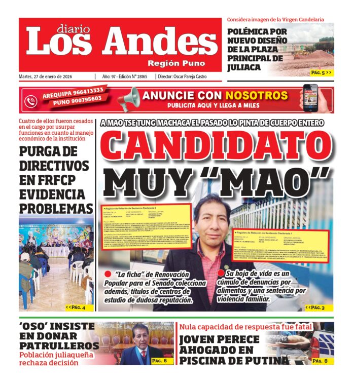 Por: Diario los Andes Fecha: enero 27, 2026 DIARIO DIGITAL PUNO: Diario Los Andes 27/01/2026 Vistas: 220 Artículo anteriorAREQUIPA: Diario Los Andes 27/01/2026Artículo siguienteAREQUIPA: Diario Los Andes 28/01/2026 Diario los Andes Compartir post: FacebookTwitterPinterestWhatsApp Suscríbete Quiero entrar He leído y acepto la Política de Privacidad. Populares Comerciantes protestan por olores nauseabundos en el camal Sermamet Pol Deportes presentó mundialmente el primer tráiler de “Spider-Man Un Nuevo Día” Arequipa: Instituciones se siguen cayendo a pedazos Arequipa: 80 unidades y dos consorcios quedarían fuera del SIT Arequipa: Pobladores protestan hartos de abusos de transportistas Más vistosMás vistos Comerciantes protestan por olores nauseabundos en el camal Sermamet Diario los Andes - marzo 18, 2026 Redacción: Jessimiel Rosas Comerciantes del mercado metropolitano de frutas realizaron... Pol Deportes presentó mundialmente el primer tráiler de “Spider-Man Un Nuevo Día” Diario los Andes - marzo 18, 2026 Redacción: Jessimiel Rosas El actor anunció una campaña global para... Arequipa: Instituciones se siguen cayendo a pedazos Diario los Andes - marzo 18, 2026 Redacción: Jean Frisancho El inicio del año escolar 2026 en... Arequipa: 80 unidades y dos consorcios quedarían fuera del SIT Diario los Andes - marzo 18, 2026 Redacción: Julissa Aquino Se les viene la noche. La...
