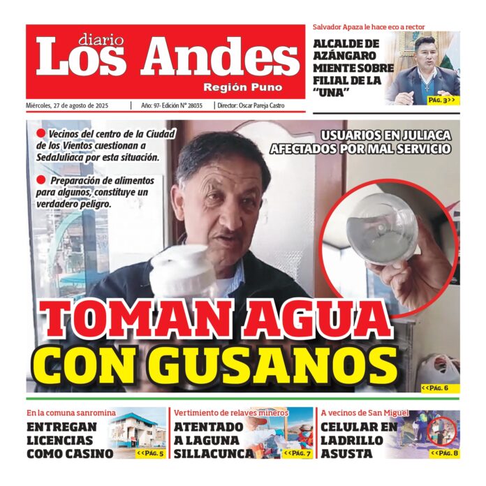 Por: Diario los Andes Fecha: agosto 27, 2025 DIARIO DIGITAL PUNO: Diario Los Andes 27/08/2025 Vistas: 66 TagsDiario DigitalDiario Los AndesPuno Artículo anteriorAREQUIPA: Diario Los Andes 27/08/2025Artículo siguienteAREQUIPA: Diario Los Andes 28/08/2025 Diario los Andes Compartir post: FacebookTwitterPinterestWhatsApp Suscríbete Quiero entrar He leído y acepto la Política de Privacidad. Populares Semanario Los Andes 13/04/2026 DIARIO LOS ANDES AREQUIPA: 12/04/2026 DIARIO LOS ANDES PUNO: 12/04/26 Arequipa: Precio del balón supera los S/50 en últimas semanas Arequipa: Detienen a adulto mayor acusado de tocamientos indebidos a menor Más vistosMás vistos Semanario Los Andes 13/04/2026 admingeneral - abril 12, 2026 DIARIO LOS ANDES AREQUIPA: 12/04/2026 admingeneral - abril 11, 2026 DIARIO LOS ANDES PUNO: 12/04/26 admingeneral - abril 11, 2026 Arequipa: Precio del balón supera los S/50 en últimas semanas admineditor - abril 11, 2026 Redacción: Jessimiel Rosas En el distrito de Cayma, el precio...