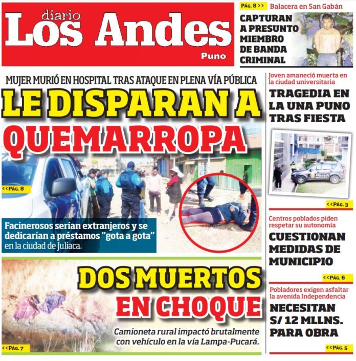 Por: Diario los Andes Fecha: septiembre 27, 2024 DIARIO DIGITAL PUNO: Diario Los Andes 27/09/2024 Vistas: 8 Artículo anteriorAREQUIPA: Diario Los Andes 27/09/2024Artículo siguienteAREQUIPA: Diario Los Andes 28/09/2024 Diario los Andes Compartir post: FacebookTwitterPinterestWhatsApp Suscríbete Quiero entrar He leído y acepto la Política de Privacidad. Populares Arequipa: Joven madre asegura que no sabía que estaba embarazada y busca recuperar a su bebé tras presunto abandono en Socabaya Arequipa: Cuarenta comisarías en riesgo de colapso Arequipa: GREA solicitó 141 aulas prefabricadas para cubrir necesidad Transportistas protestaron en el frontis de la comuna pidiendo que se permita el cobro de S/ 1.50 Precario inicio del año escolar 2026 en colegio Mariano H. Cornejo en Juliaca Más vistosMás vistos Arequipa: Joven madre asegura que no sabía que estaba embarazada y busca recuperar a su bebé tras presunto abandono en Socabaya Diario los Andes - marzo 17, 2026 Redacción: Yudith Veronica Taco Huallpa Una joven madre de... Arequipa: Cuarenta comisarías en riesgo de colapso Diario los Andes - marzo 17, 2026 Redacción: Julissa Aquino Al menos 40 comisarías de la Región... Arequipa: GREA solicitó 141 aulas prefabricadas para cubrir necesidad Diario los Andes - marzo 17, 2026 Redacción: Thais Astoquilca Rivera A pesar del inicio del año... Transportistas protestaron en el frontis de la comuna pidiendo que se permita el cobro de S/ 1.50 Diario los Andes - marzo 17, 2026 Redacción: Diario Los Andes Este jueves, en sesión extraordinaria,...