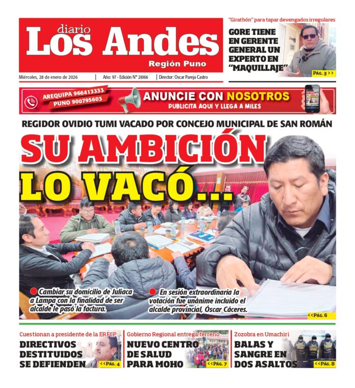 Por: Diario los Andes Fecha: enero 28, 2026 DIARIO DIGITAL PUNO: Diario Los Andes 28/01/2026 Vistas: 324 Artículo anteriorAREQUIPA: Diario Los Andes 28/01/2026Artículo siguienteAREQUIPA: Diario Los Andes 29/01/2026 Diario los Andes Compartir post: FacebookTwitterPinterestWhatsApp Suscríbete Quiero entrar He leído y acepto la Política de Privacidad. Populares Capturan a presunto asaltante vinculado a robos contra mineros en La Rinconada Día Nacional del Torito de Pucará: símbolo de identidad y tradición andina EE.UU. e Israel bombardean yacimiento de gas en Irán Bebé de dos meses perdió la vida mientras dormía en Paucarpata Comerciantes protestan por olores nauseabundos en el camal Sermamet Más vistosMás vistos Capturan a presunto asaltante vinculado a robos contra mineros en La Rinconada Diario los Andes - marzo 18, 2026 Redacción: Jessimiel Rosas La Policía detuvo a un presunto delincuente... Día Nacional del Torito de Pucará: símbolo de identidad y tradición andina Diario los Andes - marzo 18, 2026 Cada 18 de marzo se conmemora el Día Nacional... EE.UU. e Israel bombardean yacimiento de gas en Irán Diario los Andes - marzo 18, 2026 Redacción: Jessimiel Rosas Estados Unidos e Israel bombardearon este miércoles... Bebé de dos meses perdió la vida mientras dormía en Paucarpata Diario los Andes - marzo 18, 2026 Redacción: Jessimiel Rosas Una bebé de dos meses fue encontrada...