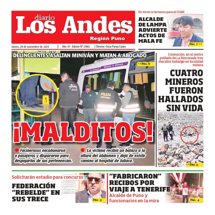 Por: Diario los Andes Fecha: noviembre 28, 2024 DIARIO DIGITAL PUNO: Diario los Andes 28/11/2024 Vistas: 29 TagsDiario DigitalDiario Los AndesPuno Artículo anteriorAREQUIPA: Diario los Andes 28/11/2024Artículo siguienteAREQUIPA: Diario los Andes 29/11/2024 Diario los Andes Compartir post: FacebookTwitterPinterestWhatsApp Suscríbete Quiero entrar He leído y acepto la Política de Privacidad. Populares DIARIO LOS ANDES AREQUIPA: 12/04/2026 DIARIO LOS ANDES PUNO: 12/04/26 Arequipa: Precio del balón supera los S/50 en últimas semanas Arequipa: Detienen a adulto mayor acusado de tocamientos indebidos a menor Puno: Alertan incremento de temperatura este domingo de elecciones generales Más vistosMás vistos DIARIO LOS ANDES AREQUIPA: 12/04/2026 admingeneral - abril 11, 2026 DIARIO LOS ANDES PUNO: 12/04/26 admingeneral - abril 11, 2026 Arequipa: Precio del balón supera los S/50 en últimas semanas admineditor - abril 11, 2026 Redacción: Jessimiel Rosas En el distrito de Cayma, el precio... Arequipa: Detienen a adulto mayor acusado de tocamientos indebidos a menor admineditor - abril 11, 2026 Redacción: Jessimiel Rosas Un hombre de 76 años fue detenido...