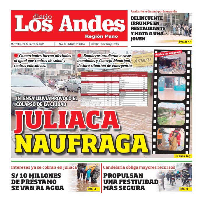 Por: Diario los Andes Fecha: enero 29, 2025 DIARIO DIGITAL PUNO: Diario los Andes 29/01/2025 Vistas: 23 TagsDiario DigitalDiario Los AndesPuno Artículo anteriorAREQUIPA: Diario los Andes 29/01/2025Artículo siguienteAREQUIPA: Diario los Andes 30/01/2025 Diario los Andes Compartir post: FacebookTwitterPinterestWhatsApp Suscríbete Quiero entrar He leído y acepto la Política de Privacidad. Populares Semanario Los Andes 13/04/2026 DIARIO LOS ANDES AREQUIPA: 12/04/2026 DIARIO LOS ANDES PUNO: 12/04/26 Arequipa: Precio del balón supera los S/50 en últimas semanas Arequipa: Detienen a adulto mayor acusado de tocamientos indebidos a menor Más vistosMás vistos Semanario Los Andes 13/04/2026 admingeneral - abril 12, 2026 DIARIO LOS ANDES AREQUIPA: 12/04/2026 admingeneral - abril 11, 2026 DIARIO LOS ANDES PUNO: 12/04/26 admingeneral - abril 11, 2026 Arequipa: Precio del balón supera los S/50 en últimas semanas admineditor - abril 11, 2026 Redacción: Jessimiel Rosas En el distrito de Cayma, el precio...