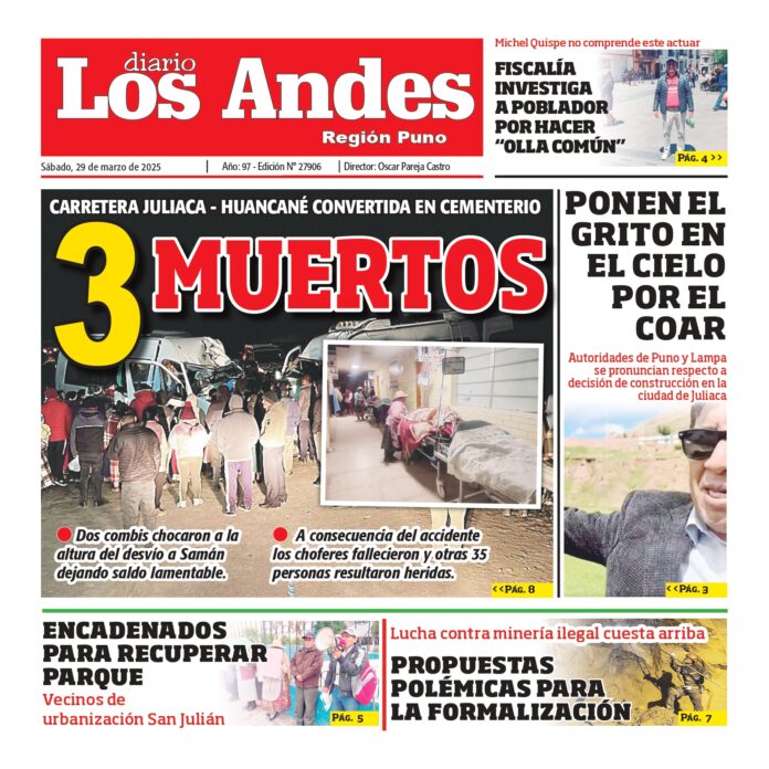 Por: Diario los Andes Fecha: marzo 29, 2025 DIARIO DIGITAL PUNO : Diario los Andes 29/03/2025 Vistas: 21 TagsDiario DigitalDiario Los AndesPuno Artículo anteriorAREQUIPA : Diario los Andes 28/03/2025Artículo siguienteAREQUIPA : Diario los Andes 29/03/2025 Diario los Andes Compartir post: FacebookTwitterPinterestWhatsApp Suscríbete Quiero entrar He leído y acepto la Política de Privacidad. Populares DIARIO LOS ANDES AREQUIPA: 26/04/26 DIARIO LOS ANDES PUNO: 26/04/26 Arequipa: Ambulantes persisten en San Camilo pese a operativos municipales Arequipa: Detienen a presunto estafador por venta de cerveza adulterada Atlético Grau y Alianza Atlético enfrentan duros retos en la fecha 12 del Apertura Más vistosMás vistos DIARIO LOS ANDES AREQUIPA: 26/04/26 admingeneral - abril 25, 2026 DIARIO LOS ANDES PUNO: 26/04/26 admingeneral - abril 25, 2026 Arequipa: Ambulantes persisten en San Camilo pese a operativos municipales admineditor - abril 25, 2026 El comercio informal sigue presente en los alrededores del... Arequipa: Detienen a presunto estafador por venta de cerveza adulterada admineditor - abril 25, 2026 Redacción: Jessimiel Rosas Agentes de la unidad de Halcones de...