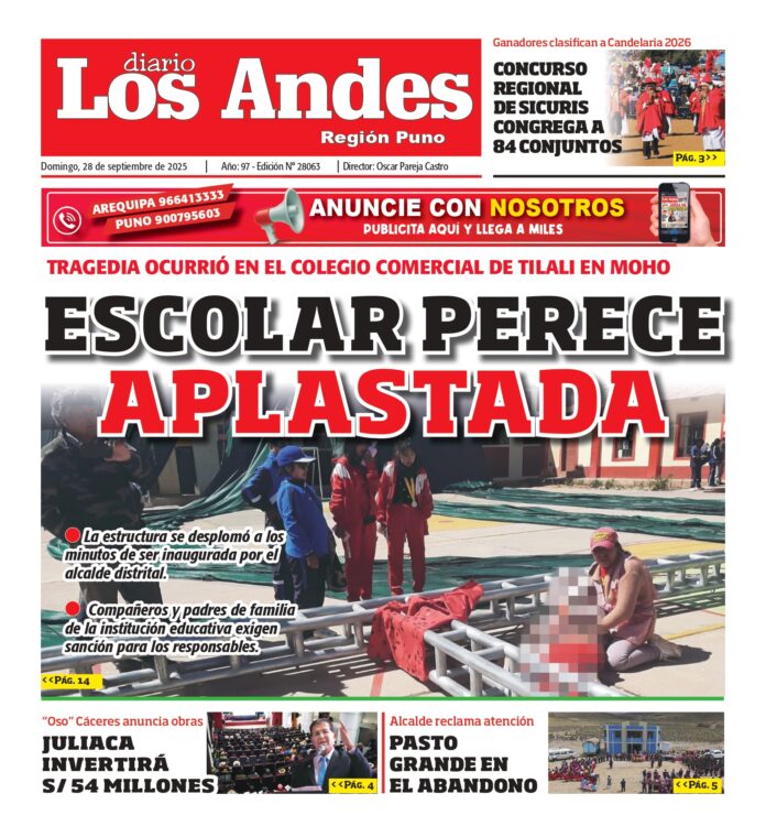 Por: Diario los Andes Fecha: septiembre 28, 2025 DIARIO DIGITAL PUNO: Diario Los Andes 29/09/2025 Vistas: 38 Artículo anteriorAREQUIPA: Diario Los Andes 29/09/2025Artículo siguienteSemanario Los Andes 29/09/2025 Diario los Andes Compartir post: FacebookTwitterPinterestWhatsApp Suscríbete Quiero entrar He leído y acepto la Política de Privacidad. Populares Emiten alerta ante precipitaciones en siete provincias de la región Puno Kimberly García vuelve a consagrarse campeona mundial Fallas en cédulas para invidentes A 25 se incrementan los casos de sarampión en la región Puno Sal de Maras: el tesoro natural del Perú que conquista cocinas y negocios Más vistosMás vistos Emiten alerta ante precipitaciones en siete provincias de la región Puno admineditor - abril 13, 2026 El Centro de Operaciones de Emergencia Regional (COER) ha... Kimberly García vuelve a consagrarse campeona mundial admineditor - abril 13, 2026 Kimberly García volvió a hacer historia para el deporte... Fallas en cédulas para invidentes admineditor - abril 13, 2026 Redacción: Jean Frisancho Electores invidentes denunciaron serias dificultades para ejercer... A 25 se incrementan los casos de sarampión en la región Puno admineditor - abril 13, 2026 Hasta hoy, lunes 13 de abril, los contagios de...