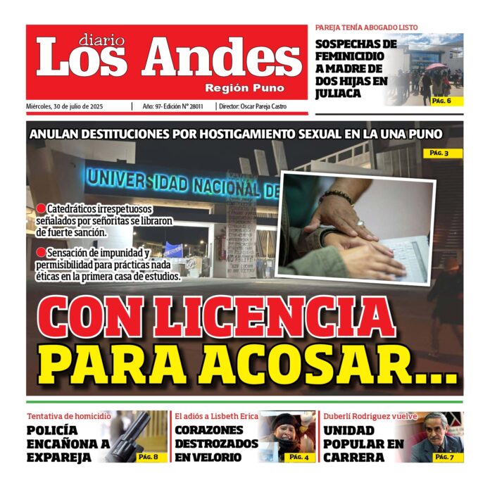 Por: Diario los Andes Fecha: julio 30, 2025 DIARIO DIGITAL PUNO: Diario Los Andes 30/07/2025 Vistas: 27 TagsDiario DigitalDiario Los AndesPuno Artículo anteriorAREQUIPA: Diario Los Andes 30/07/2025Artículo siguienteAREQUIPA: Diario Los Andes 31/07/2025 Diario los Andes Compartir post: FacebookTwitterPinterestWhatsApp Suscríbete Quiero entrar He leído y acepto la Política de Privacidad. Populares Arequipa: A clases virtuales por paro del SIT Tránsito libre en Arequipa y costo del pasaje sin control Puno: Obrero fallece al caer de cuarto piso en la urbanización Simón Bolívar Juliaca: Grifos acaparan combustible pero ellos aseguran escasez Juliaca: Retiran propaganda electoral instalados en áreas verdes de la ciudad Más vistosMás vistos Arequipa: A clases virtuales por paro del SIT Diario los Andes - marzo 12, 2026 Redacción: Thais Astoquilca Rivera A solo tres días del inicio... Tránsito libre en Arequipa y costo del pasaje sin control Diario los Andes - marzo 12, 2026 Redacción: Julissa Aquino Insostenible. La crisis en el transporte público... Puno: Obrero fallece al caer de cuarto piso en la urbanización Simón Bolívar Diario los Andes - marzo 12, 2026 Redacción: Javier Calderón Un trágico accidente laboral enluta a una... Juliaca: Grifos acaparan combustible pero ellos aseguran escasez Diario los Andes - marzo 12, 2026 Redacción: Reynaldo Puma La fiscal de Prevención del Delito, Marifé...