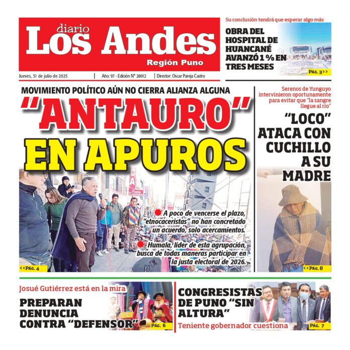 Por: Diario los Andes Fecha: julio 31, 2025 DIARIO DIGITAL PUNO: Diario Los Andes 31/07/2025 Vistas: 19 Artículo anteriorAREQUIPA: Diario Los Andes 31/07/2025Artículo siguientePUNO: Diario Los Andes 01/08/2025 Diario los Andes Compartir post: FacebookTwitterPinterestWhatsApp Suscríbete Quiero entrar He leído y acepto la Política de Privacidad. Populares Arequipa: A clases virtuales por paro del SIT Tránsito libre en Arequipa y costo del pasaje sin control Puno: Obrero fallece al caer de cuarto piso en la urbanización Simón Bolívar Juliaca: Grifos acaparan combustible pero ellos aseguran escasez Juliaca: Retiran propaganda electoral instalados en áreas verdes de la ciudad Más vistosMás vistos Arequipa: A clases virtuales por paro del SIT Diario los Andes - marzo 12, 2026 Redacción: Thais Astoquilca Rivera A solo tres días del inicio... Tránsito libre en Arequipa y costo del pasaje sin control Diario los Andes - marzo 12, 2026 Redacción: Julissa Aquino Insostenible. La crisis en el transporte público... Puno: Obrero fallece al caer de cuarto piso en la urbanización Simón Bolívar Diario los Andes - marzo 12, 2026 Redacción: Javier Calderón Un trágico accidente laboral enluta a una... Juliaca: Grifos acaparan combustible pero ellos aseguran escasez Diario los Andes - marzo 12, 2026 Redacción: Reynaldo Puma La fiscal de Prevención del Delito, Marifé...