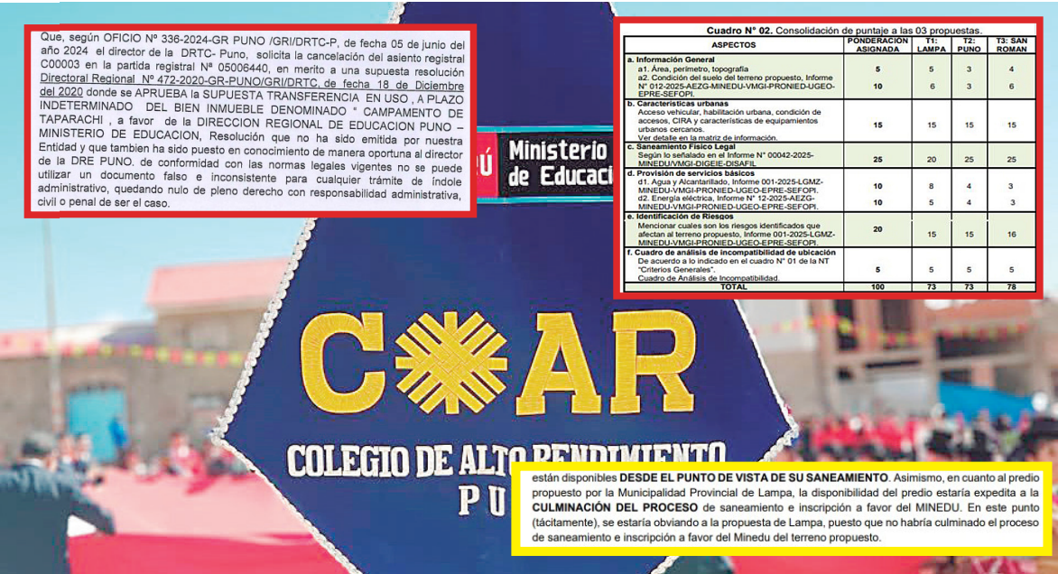 En este punto, aparecen los argumentos puneños. Estos se basan en un oficio remitido por la Dirección Regional de Transportes y Comunicaciones a la UGEL San Román en donde le indica que la transferencia del terreno ‘Campamento Taparachi’ destinado al COAR, se concretó con documentos fraguados.