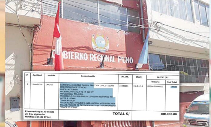 La orden de compra 02659 del gobierno regional da cuenta de la adquisición de una camioneta por la suma de S/ 180 mil a pesar que, según sus especificaciones, el costo según el catálogo de Mitsubishi como máximo llega a S/ 149 mil.