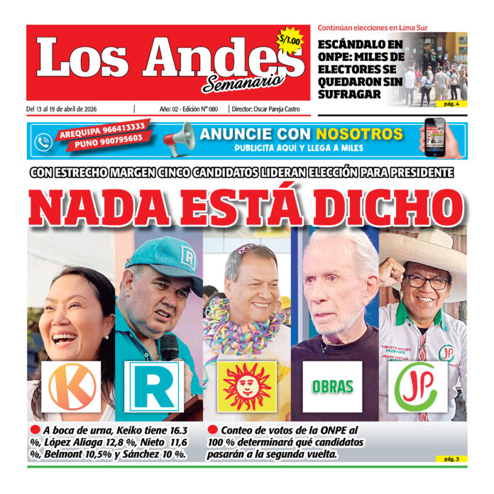 Por: admingeneral Fecha: abril 12, 2026 DIARIO DIGITAL Semanario Los Andes 13/04/2026 Vistas: 13 Artículo anteriorDIARIO LOS ANDES AREQUIPA: 12/04/2026 admingeneralhttp://adminlosandes DEJAR UNA RESPUESTA Cancelar respuesta Comentario: Por favor, introduzca su comentario Nombre:* Introduzca aquí su nombre Correo electrónico:* Ha introducido una dirección de correo electrónico incorrecta Introduzca aquí su dirección de correo electrónico Página web: Guarda mi nombre, correo electrónico y sitio web en este navegador para la próxima vez que comente. Compartir post: FacebookTwitterPinterestWhatsApp Suscríbete Quiero entrar He leído y acepto la Política de Privacidad. Populares DIARIO LOS ANDES AREQUIPA: 12/04/2026 DIARIO LOS ANDES PUNO: 12/04/26 Arequipa: Precio del balón supera los S/50 en últimas semanas Arequipa: Detienen a adulto mayor acusado de tocamientos indebidos a menor Puno: Alertan incremento de temperatura este domingo de elecciones generales Más vistosMás vistos DIARIO LOS ANDES AREQUIPA: 12/04/2026 admingeneral - abril 11, 2026 DIARIO LOS ANDES PUNO: 12/04/26 admingeneral - abril 11, 2026 Arequipa: Precio del balón supera los S/50 en últimas semanas admineditor - abril 11, 2026 Redacción: Jessimiel Rosas En el distrito de Cayma, el precio... Arequipa: Detienen a adulto mayor acusado de tocamientos indebidos a menor admineditor - abril 11, 2026 Redacción: Jessimiel Rosas Un hombre de 76 años fue detenido...