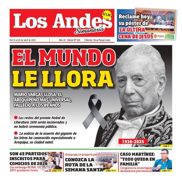 Por: Diario los Andes Fecha: abril 14, 2025 DIARIO DIGITAL Semanario Los Andes 14/04/2025 Vistas: 144 Artículo anteriorAREQUIPA: Diario los Andes 13/04/2025Artículo siguienteAREQUIPA: Diario los Andes 15/04/2025 Diario los Andes Compartir post: FacebookTwitterPinterestWhatsApp Suscríbete Quiero entrar He leído y acepto la Política de Privacidad. Populares Crean la Universidad Nacional Tecnológica Intercultural de Pomata Puno: Detectan conexiones clandestinas de aguas residuales Puno: Sereno grave tras ser embestido por combi de empresa “Dorado” Contraloría dispone que regidores y consejeros rindan cuentas Puno: Alianza con dirigentes magisteriales fue clave Más vistosMás vistos Crean la Universidad Nacional Tecnológica Intercultural de Pomata admineditor - abril 14, 2026 En el diario oficial El Peruano, se publicó la... Puno: Detectan conexiones clandestinas de aguas residuales admineditor - abril 14, 2026 La comuna provincial de Puno en coordinación con EMSA... Puno: Sereno grave tras ser embestido por combi de empresa “Dorado” admineditor - abril 14, 2026 Un agente de Serenazgo de la Municipalidad de Puno... Contraloría dispone que regidores y consejeros rindan cuentas admineditor - abril 14, 2026 La Contraloría General de la República dispuso que regidores...