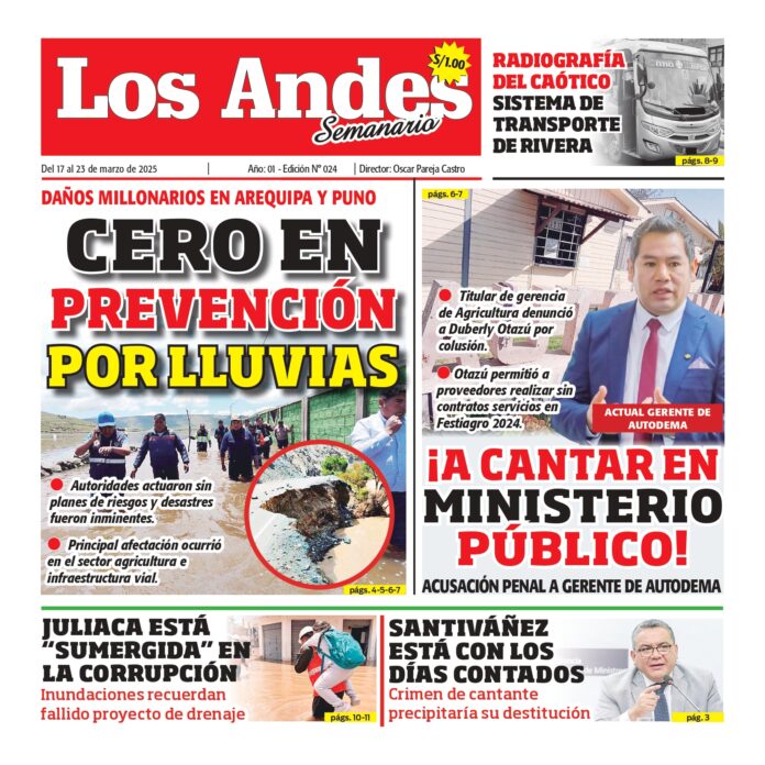 Por: Diario los Andes Fecha: marzo 16, 2025 DIARIO DIGITAL Semanario Los Andes 17/03/2025 Vistas: 50 TagsDiario DigitalLos AndesSemanario Artículo anteriorAREQUIPA : Diario los Andes 16/03/2025Artículo siguienteAREQUIPA : Diario los Andes 18/03/2025 Diario los Andes Compartir post: FacebookTwitterPinterestWhatsApp Suscríbete Quiero entrar He leído y acepto la Política de Privacidad. Populares Semanario Los Andes 13/04/2026 DIARIO LOS ANDES AREQUIPA: 12/04/2026 DIARIO LOS ANDES PUNO: 12/04/26 Arequipa: Precio del balón supera los S/50 en últimas semanas Arequipa: Detienen a adulto mayor acusado de tocamientos indebidos a menor Más vistosMás vistos Semanario Los Andes 13/04/2026 admingeneral - abril 12, 2026 DIARIO LOS ANDES AREQUIPA: 12/04/2026 admingeneral - abril 11, 2026 DIARIO LOS ANDES PUNO: 12/04/26 admingeneral - abril 11, 2026 Arequipa: Precio del balón supera los S/50 en últimas semanas admineditor - abril 11, 2026 Redacción: Jessimiel Rosas En el distrito de Cayma, el precio...