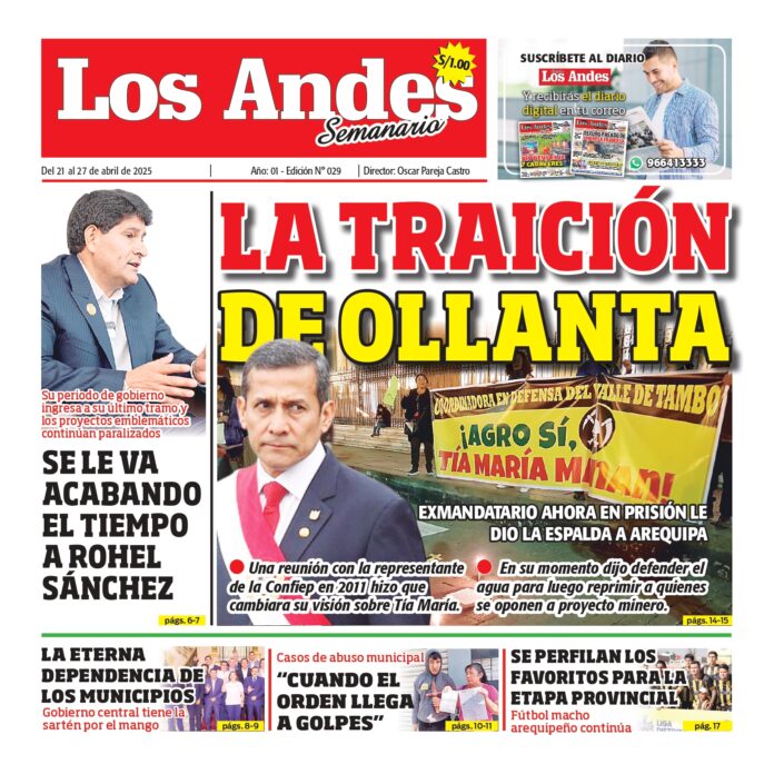 Por: Diario los Andes Fecha: abril 20, 2025 DIARIO DIGITAL Semanario Los Andes 21/04/2025 Vistas: 35 TagsDiario DigitalDiario Los AndesLos AndesSemanario Artículo anteriorAREQUIPA: Diario los Andes 20/04/2025Artículo siguienteAREQUIPA: Diario los Andes 22/04/2025 Diario los Andes Compartir post: FacebookTwitterPinterestWhatsApp Suscríbete Quiero entrar He leído y acepto la Política de Privacidad. Populares Semanario Los Andes 13/04/2026 DIARIO LOS ANDES AREQUIPA: 12/04/2026 DIARIO LOS ANDES PUNO: 12/04/26 Arequipa: Precio del balón supera los S/50 en últimas semanas Arequipa: Detienen a adulto mayor acusado de tocamientos indebidos a menor Más vistosMás vistos Semanario Los Andes 13/04/2026 admingeneral - abril 12, 2026 DIARIO LOS ANDES AREQUIPA: 12/04/2026 admingeneral - abril 11, 2026 DIARIO LOS ANDES PUNO: 12/04/26 admingeneral - abril 11, 2026 Arequipa: Precio del balón supera los S/50 en últimas semanas admineditor - abril 11, 2026 Redacción: Jessimiel Rosas En el distrito de Cayma, el precio...
