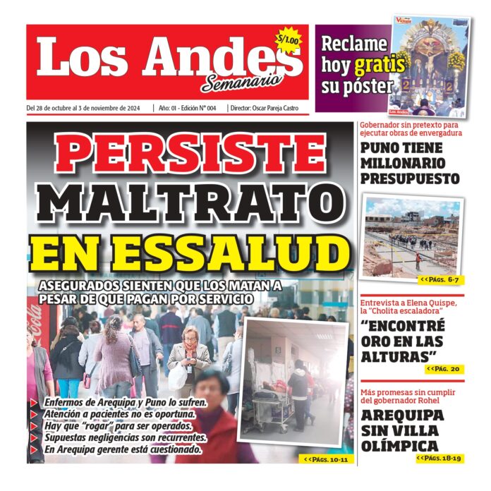 Por: Diario los Andes Fecha: octubre 27, 2024 DIARIO DIGITAL Semanario Los Andes 28/10/2024 Vistas: 13 Artículo anteriorAREQUIPA: Diario los Andes 27/10/2024Artículo siguienteAREQUIPA: Diario los Andes 29/10/2024 Diario los Andes Compartir post: FacebookTwitterPinterestWhatsApp Suscríbete Quiero entrar He leído y acepto la Política de Privacidad. Populares A 25 se incrementan los casos de sarampión en la región Puno Sal de Maras: el tesoro natural del Perú que conquista cocinas y negocios Voto puneño fue determinante Puno: Varón muere tras presunta caída de cinco metros en Alto Huáscar INCIDENCIAS EN LAS ELECCIONES Más vistosMás vistos A 25 se incrementan los casos de sarampión en la región Puno admineditor - abril 13, 2026 Hasta hoy, lunes 13 de abril, los contagios de... Sal de Maras: el tesoro natural del Perú que conquista cocinas y negocios admineditor - abril 13, 2026 En un contexto donde los consumidores buscan productos naturales,... Voto puneño fue determinante admineditor - abril 13, 2026 Durante la jornada electoral de este 12 de abril... Puno: Varón muere tras presunta caída de cinco metros en Alto Huáscar admineditor - abril 13, 2026 Un lamentable hecho se registró en el barrio Alto...