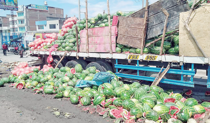 Frutas como melón y sandía quedaron esparcidas en la vía tras el accidente de tránsito. Si bien no hubo heridos, las pérdidas económicas son considerables, estimándose en aproximadamente 100 mil soles.