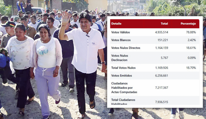 Morales celebró el 19 % de votos nulos, que promovió como forma de protesta por su inhabilitación como candidato, señalando que esta cifra lo posiciona en un simbólico “tercer lugar” y que, sumado a los votos blancos y el ausentismo, podría superar a los candidatos principales. Afirmó: “Falta todavía, con el voto del campo va a seguir creciendo el voto nulo.